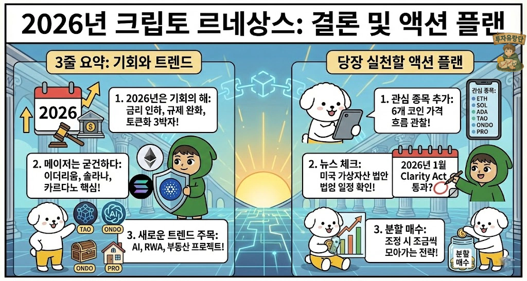 2026년은 크립토 시장의 르네상스가 될 가능성이 큽니다. 오늘 소개해 드린 내용을 3줄로 요약해 보겠습니다.