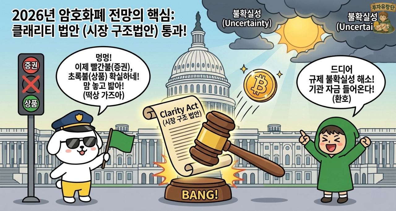 오늘 이 글을 끝까지 읽으시면, 2026년 암호화폐 전망을 뒤흔들 결정적인 ‘한 방’인 클래리티 법안(Clarity Act)의 정체와, 왜 지금이 기관 투자자들이 몰려오는 골든타임인지 확실하게 알게 되실 겁니다.