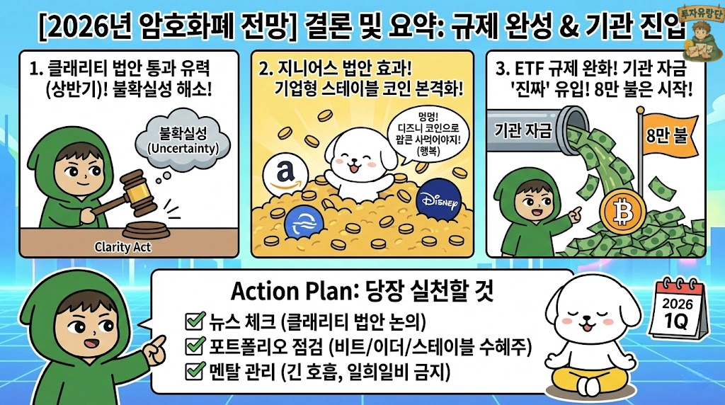 2026년은 그저 그런 또 다른 해가 아닙니다. 2026년 암호화폐 전망은 ‘규제의 완성’과 ‘기관의 진입’으로 요약할 수 있습니다. 바쁘신 분들을 위해 3줄로 정리해 드립니다.