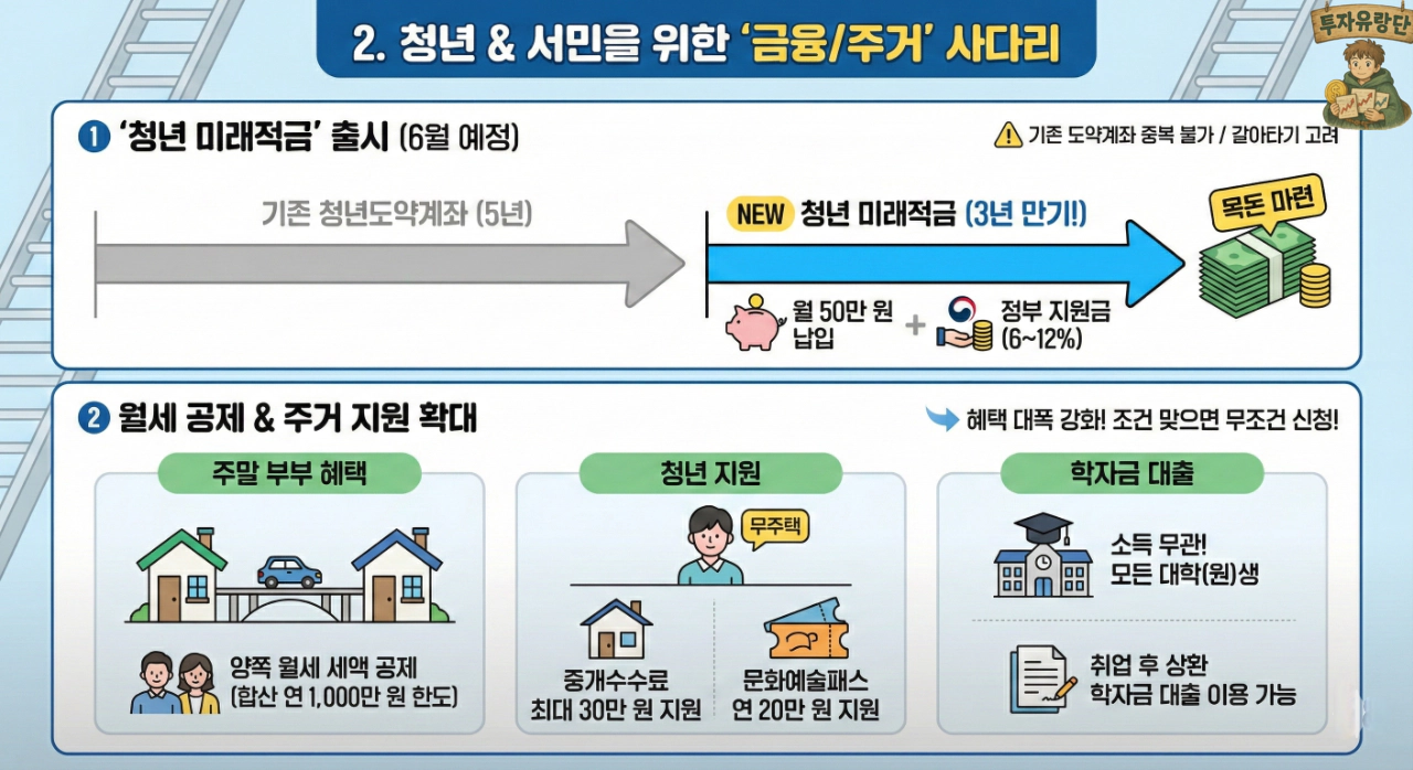 청년 지원: 무주택 청년에게 부동산 중개수수료 최대 30만 원 지원, 청년 문화예술패스 연 20만 원 지원 등이 시행됩니다.