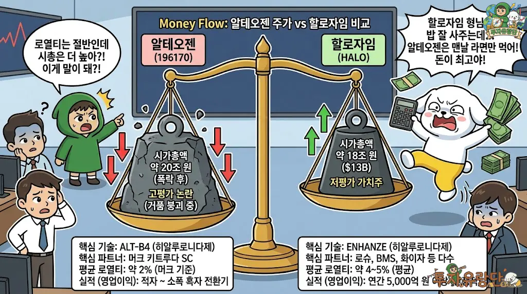 핵심: 알테오젠 주가는 돈을 훨씬 잘 버는 할로자임보다 비쌉니다. 로열티율은 절반인데 시총은 더 높은 이 기형적인 구조가 알테오젠 전망을 짓누르는 가장 큰 리스크입니다.