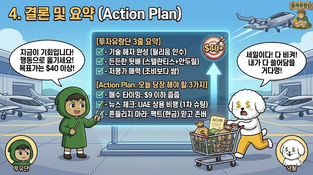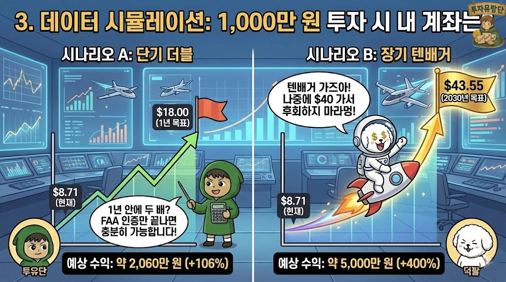 분석: 현재 FAA 인증이 4단계 막바지(15% 완료)입니다. 2026년 3분기부터 UAE(아부다비) 상용 비행이 시작되면 매출이 찍히기 시작합니다. 이때 전고점 $18은 가볍게 뚫습니다. 1년 안에 더블(100%)? 충분히 가능합니다.