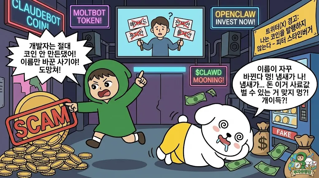 개발자 피터 스타인버거는 트위터(X)를 통해 “나는 절대 코인을 발행하지 않는다”고 수차례 경고했습니다. 하지만 스캠 세력들은 리브랜딩으로 버려진 구(舊) 계정을 탈취하거나 유사한 이름의 토큰($CLAWD)을 만들어 투자자들을 유혹하고 있습니다.