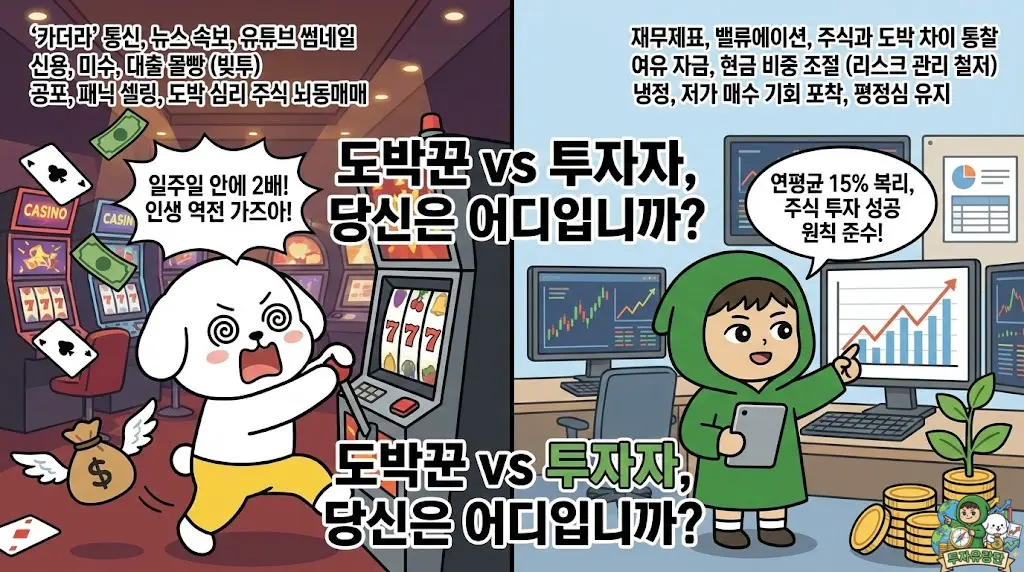 | 판단의 근거 | ‘카더라’ 통신, 뉴스 속보, 유튜브 썸네일 | 재무제표, 밸류에이션, 주식과 도박 차이 통찰 |