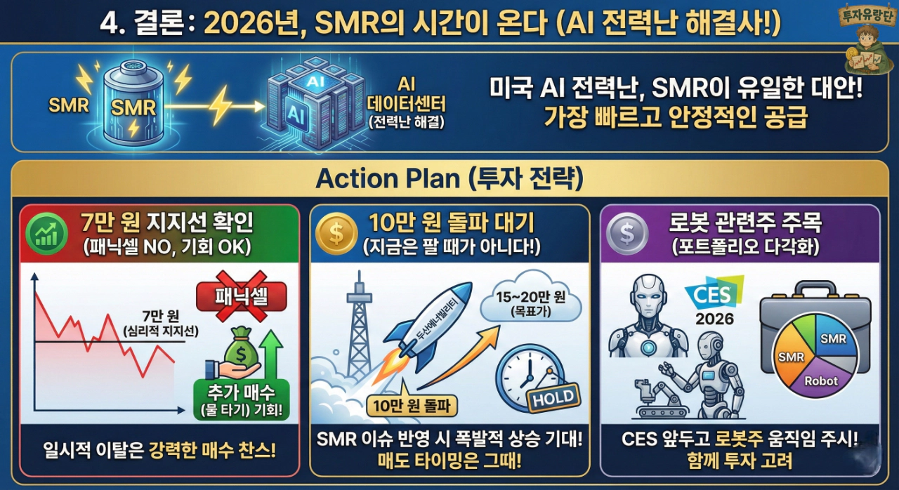 2. 10만 원 돌파 대기: SMR 이슈가 제대로 반영되면 15만 원, 20만 원 이야기가 나올 겁니다. 그때가 매도 타이밍입니다. 지금은 파는 때가 아닙니다.