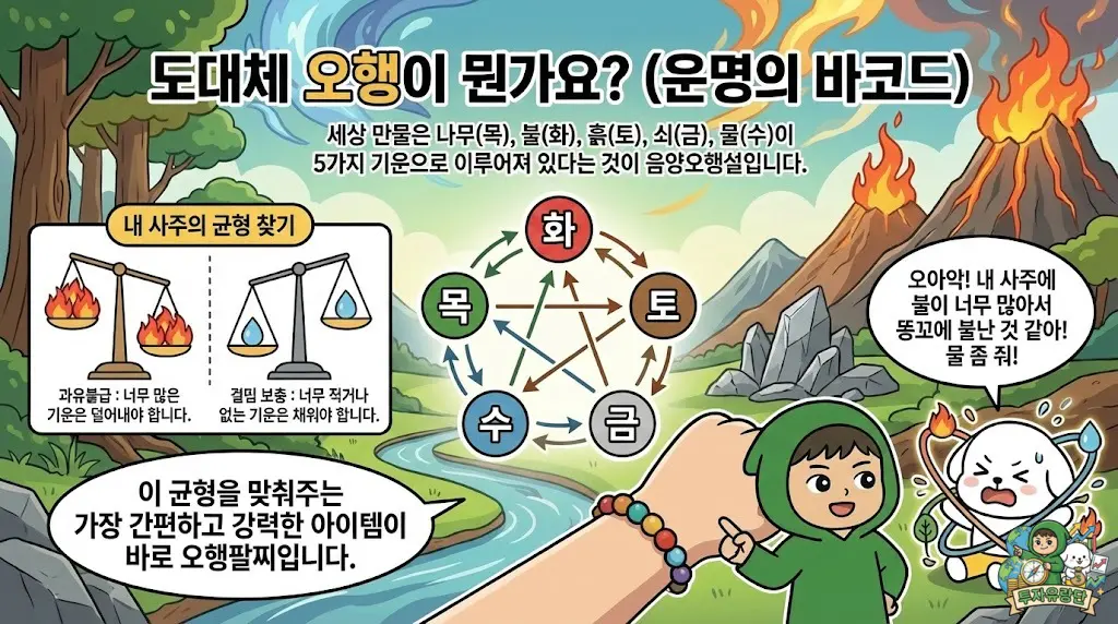 오행팔찌, 단순히 예뻐서 차는 것이 아니라 내 운명을 보완해 주는 도구라는 사실, 알고 계셨나요? 사주(四柱)는 태어날 때 정해지지만, 부족한 기운은 후천적인 노력으로 충분히 채울 수 있습니다.