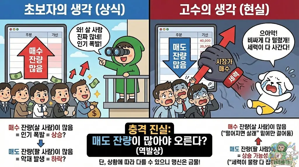 자, 여기서부터가 진짜입니다. 집중하세요! 초보자들이 가장 많이 하는 오해가 바로 매수 잔량 매도 잔량의 해석입니다.