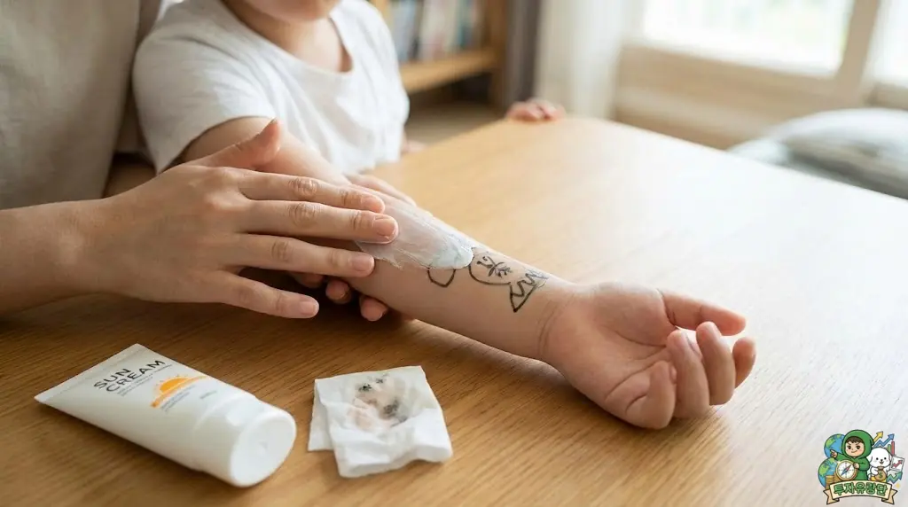 아이들 얼굴이나 손에 매직이 묻었을 때, 독한 아세톤을 쓸 수는 없죠? 이때 가장 안전하고 효과적인 방법은 바로 선크림입니다.
