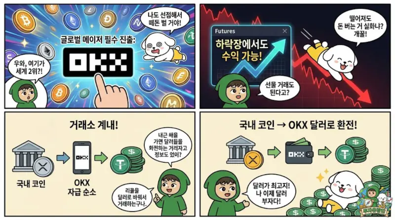 왜 해외 거래소를 써야 할까요? 국내에는 없는 수백 가지의 유망한 글로벌 코인들을 가장 먼저 선점할 수 있으며, 하락장에서도 수익을 낼 수 있는 선물(Futures) 거래가 가능하기 때문입니다. 국내 거래소에서 샀던 코인(리플 등)을 OKX 지갑 주소로 전송하여 달러(USDT)로 바꾼 뒤 거래하는 방식입니다.