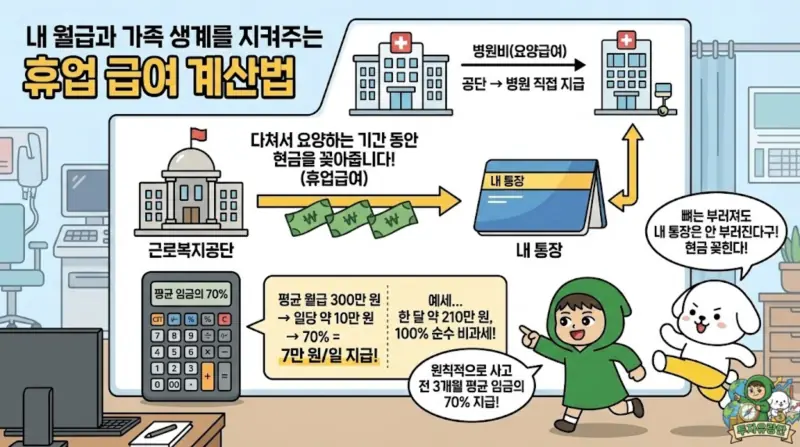 바로 이 대목에서 국가의 막강한 현금 지원 제도가 발동합니다. 근로복지공단은 다쳐서 요양하느라 쉬는 기간 동안 여러분의 통장으로 직접 현금을 꽂아줍니다. 이를 ‘휴업급여’라고 부릅니다.
