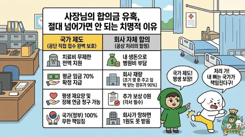 | 핵심 비교 항목 | 국가 제도 (공단 직접 접수 완벽 보호) | 회사 자체 합의 (공상 처리의 함정) |
