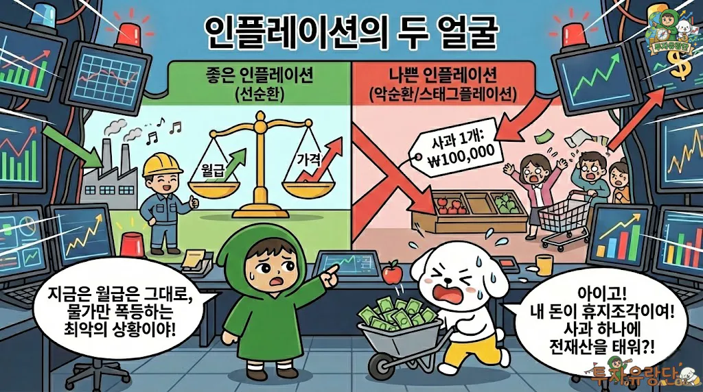 좋은 인플레이션: 경기가 좋아서 내 월급도 오르고 물가도 오릅니다. 소비가 늘고 기업이 투자를 늘리는 선순환 구조입니다.