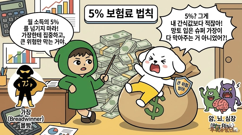 예를 들어, 월 500만 원 버는 가장이라면 보험료는 최대 25만 원으로 끊어야 합니다. “에이, 25만 원으로 암보험, 실비, 종신보험 다 어떻게 해요?”라고 반문하시겠죠. 그게 바로 함정입니다. 모든 위험을 다 막으려고 하니까 지갑이 빵꾸가 나는 겁니다.