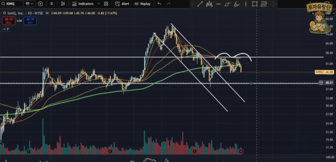 냉정하게 차트를 한번 볼까요? 현재 아이온큐 주가는 40달러 지지선과 60달러 저항선 사이인 박스권에 갇혀 있습니다.