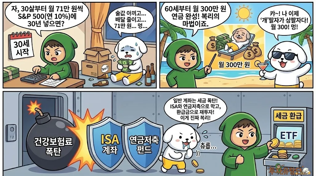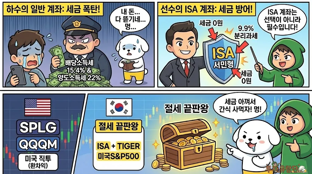절세 끝판왕: 세금을 아끼려면 ISA 계좌에서 국내 상장 해외 ETF(TIGER 미국S&P500 등)를 담으세요. 3년 의무 가입? 어차피 노후 자금 만들 건데 3년도 못 버티면 주식 접어야죠.