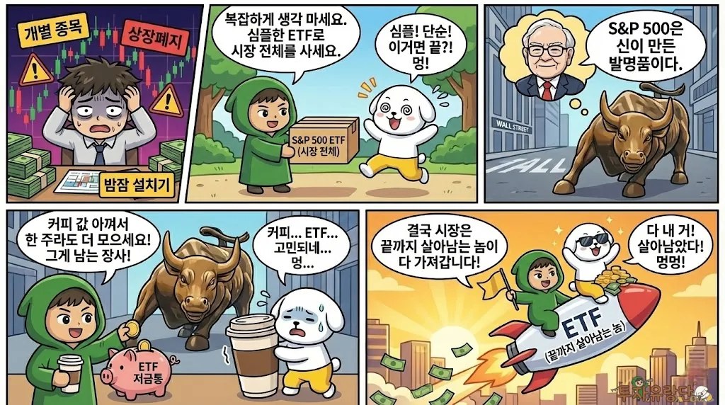 복잡하게 생각하지 마세요. 투자는 심플할수록 강력합니다. 개별 종목으로 대박 노리다가 상장폐지 걱정에 밤잠 설치지 말고, 시장 전체를 사는 ETF로 마음 편하게 가세요.
