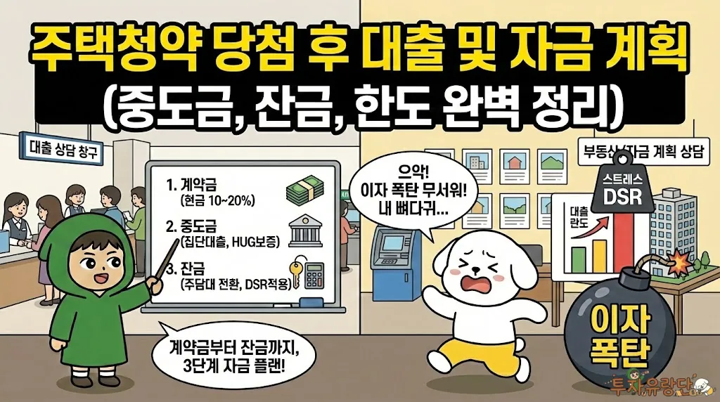 특히 2026년은 스트레스 DSR 규제가 강력하게 적용되는 시기인 만큼, 미리 한도를 계산하지 않으면 입주를 포기해야 하는 최악의 상황이 발생할 수도 있습니다. 본 글에서는 주택청약 당첨 후 자금 조달의 3단계 흐름과 중도금 및 잔금 대출의 차이, 그리고 2026년 기준 주담대 한도 확보 전략을 완벽하게 정리해 드립니다.