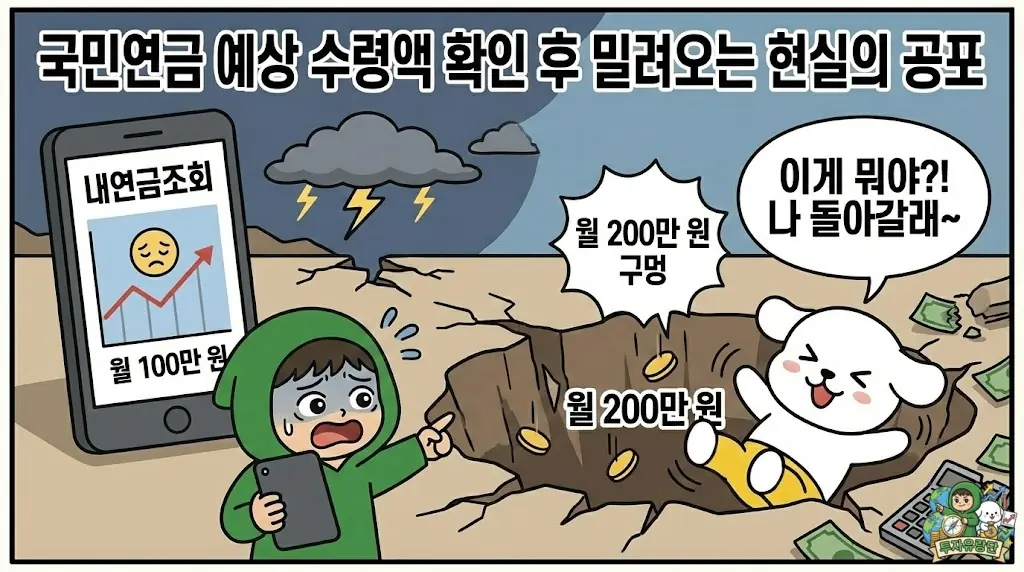 그런데 막상 화면에 찍힌 국민연금 예상 수령액은 고작 100만 원 남짓일 확률이 압도적으로 높습니다. 무려 매월 200만 원이라는 거대한 늪 같은 구멍이 발생하게 됩니다.