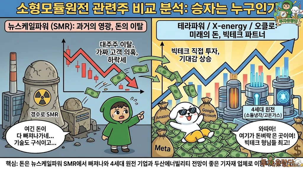 시장은 냉정합니다. 아마존, 구글, 메타 등 빅테크 기업들은 수십조 원을 쏟아붓고 있지만, 정작 그 돈은 뉴스케일파워 SMR이 아닌 경쟁사(X-energy, TerraPower, Oklo)로 흘러들어가고 있습니다. 이것은 단순한 소외가 아니라, 스마트머니가 보내는 강력한 경고 신호입니다.