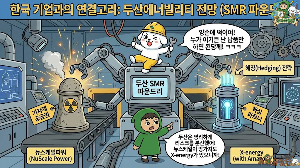 결론: 뉴스케일이 망가져도 두산에너빌리티 전망은 X-energy를 통해 살아남습니다. 두산은 SMR 시장의 ‘파운드리(위탁생산)’로서, 누가 이기든 기자재만 납품하면 됩니다. 따라서 두산의 존재가 뉴스케일파워 주가 방어의 보증수표가 될 수는 없습니다.