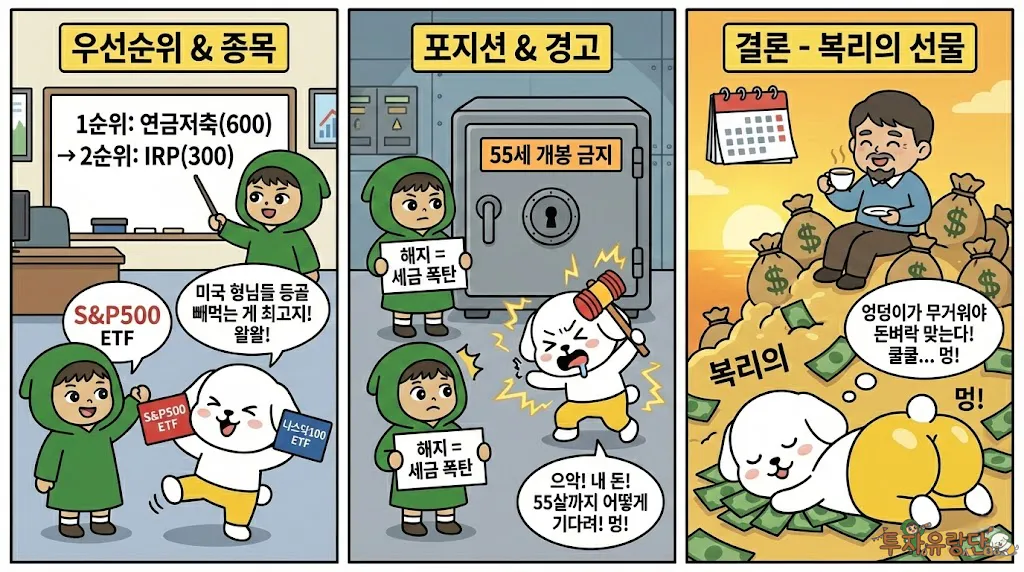 복잡하게 생각하지 마세요. 투자는 심플할수록 강력합니다. “연금저축펀드 먼저 600만 원 채우고, 여유 되면 IRP 300만 원 채운다.” 이 순서만 기억하세요. IRP는 안전 자산 의무 비율(30%) 때문에 좀 귀찮거든요.