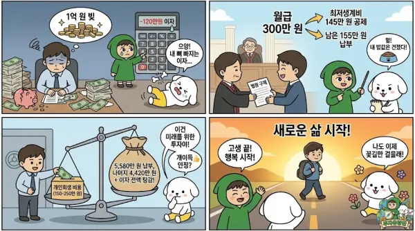 하지만 법원의 구제 절차를 밟게 되면 이야기가 완전히 달라집니다. 2026년 기준 1인 가구 법정 최저생계비인 약 145만 원을 A씨의 월급 300만 원에서 먼저 무조건 빼줍니다. 남은 금액인 155만 원(가용소득)만 매달 법원에 성실하게 납부하면 되는 것입니다.