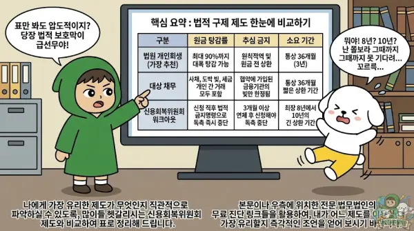 나에게 가장 유리한 제도가 무엇인지 직관적으로 파악하실 수 있도록, 많이들 헷갈리시는 신용회복위원회 제도와 비교하여 표로 정리해 드립니다.