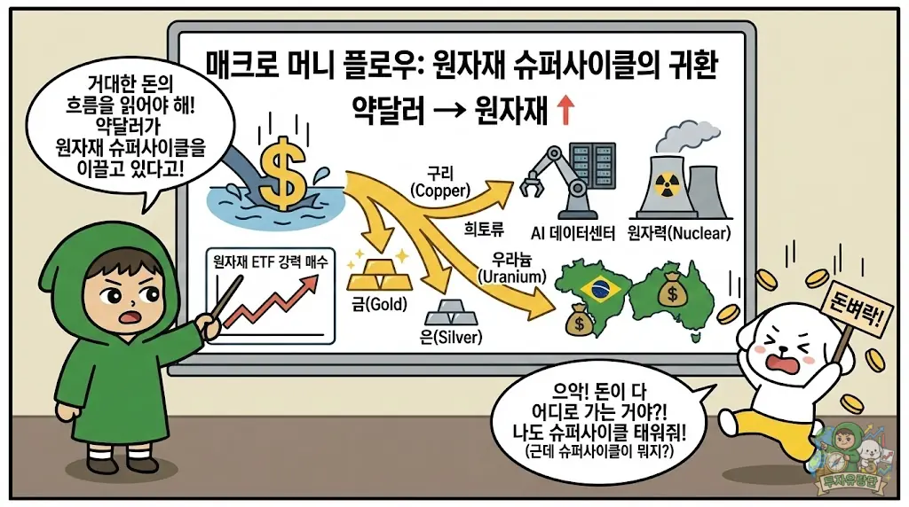 3. 진짜 기회는 딴 곳에: 이미 과열된 개별 종목보다, 약달러와 원자재 슈퍼사이클의 수혜를 온전히 받을 수 있는 ETF(REMX, URA)나 저평가된 신흥국(브라질 등)이 훨씬 안전한 피난처입니다.