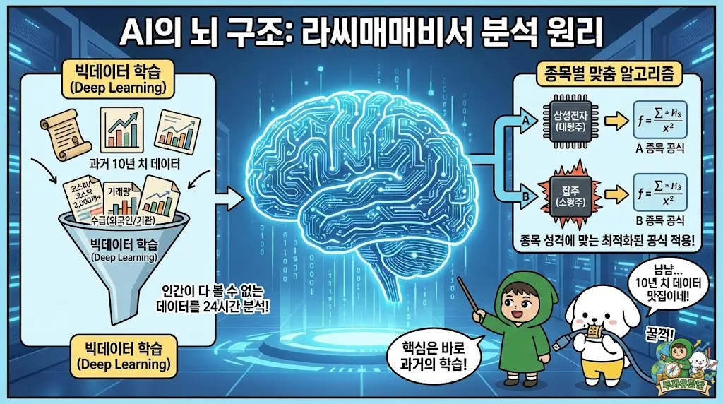 라씨매매비서는 코스피, 코스닥에 상장된 모든 종목(약 2,000개 이상)의 과거 10년 치 이상의 데이터를 씹어먹었습니다. 차트의 흐름, 거래량, 수급 주체(외국인/기관)의 움직임 등 인간이 도저히 다 볼 수 없는 데이터를 AI가 24시간 분석합니다.