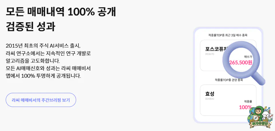 무조건 믿으라고 하지 않습니다. 이 앱은 각 종목별로 ‘최근 1년 적중률’과 ‘누적 수익률’을 100% 공개합니다. 예를 들어, “이 종목에서 라씨가 매매 신호를 10번 보냈는데, 그중 8번은 수익이 났고 2번은 손절했다”는 식의 데이터를 보여줍니다. 투자자님은 적중률이 80% 이상인 ‘우등생 종목’만 골라서 따라 하면 승률을 비약적으로 높일 수 있습니다.