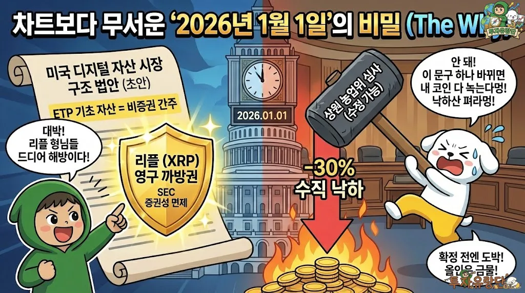 이게 왜 대박이냐: 이미 그레이스케일, 프랭클린 템플턴 같은 월가 형님들이 XRP 상품을 굴리고 있죠. 이 법안이 이대로 통과되면? 리플은 SEC(미 증권거래위원회)가 십수 년간 괴롭힌 ‘증권성 시비’에서 영구 까방권(면제)을 획득합니다. 이건 호재 맞습니다.