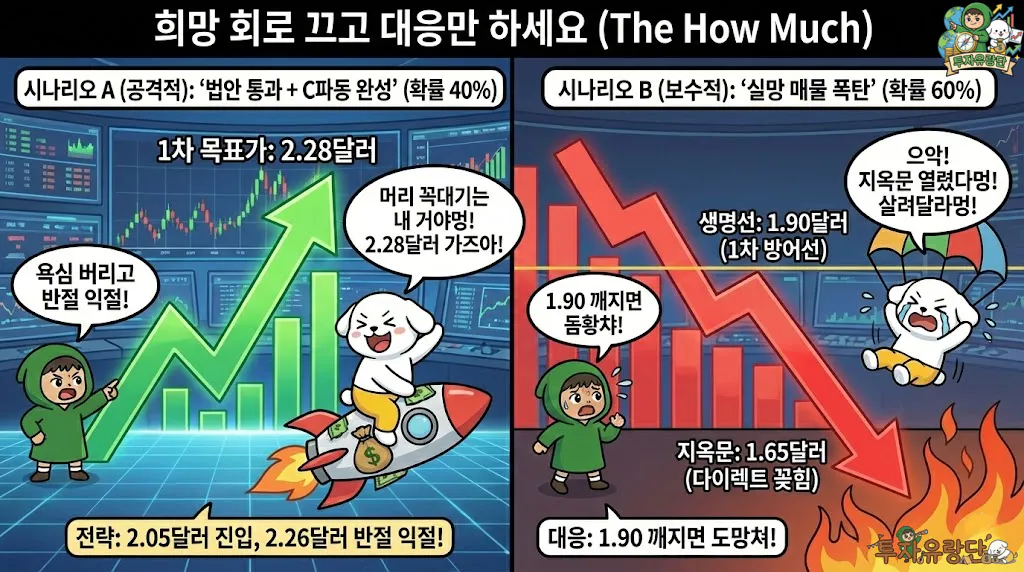 지옥문: 만약 1.90달러가 깨진다? 실망 매물 쏟아지며 1.65달러까지 다이렉트로 꽂힙니다. 이때는 물 타지 말고 도망쳐야 합니다.