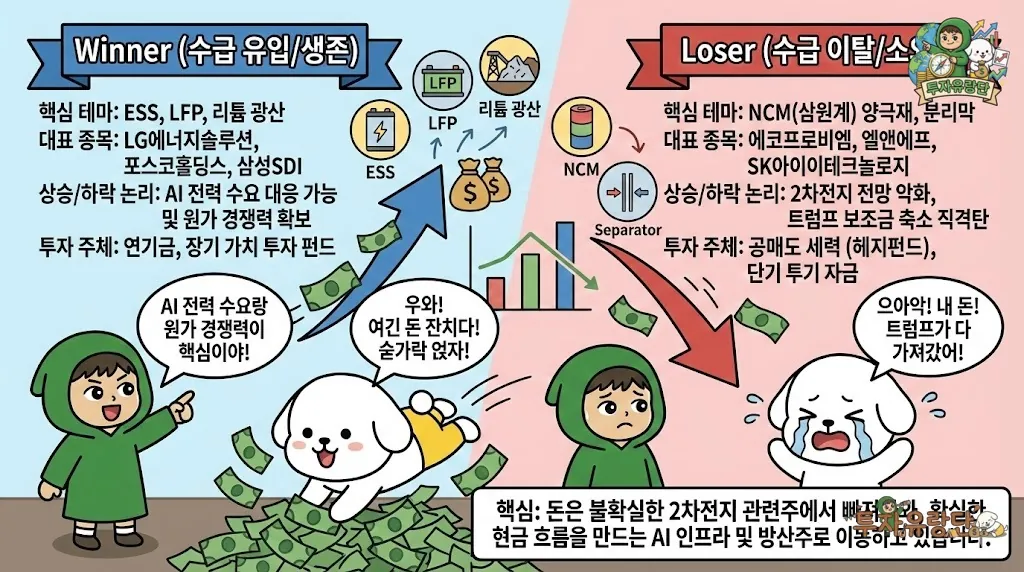 | 핵심 테마 | ESS(에너지저장), LFP, 리튬 광산 | NCM(삼원계) 양극재, 분리막 |
