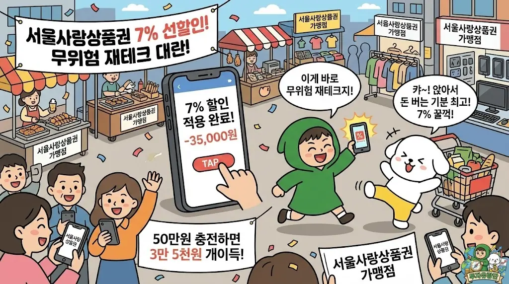 서울사랑상품권은 서울시 각 자치구에서 발행하는 모바일 상품권으로, 무려 7%라는 파격적인 선할인 혜택을 제공합니다. 예를 들어 50만 원어치를 충전하면 내 통장에서는 46만 5천 원만 빠져나가고, 앱에는 50만 원이 고스란히 충전되는 마법 같은 시스템입니다. 앉은자리에서 3만 5천 원을 번 셈이죠. 단순한 지역화폐할인의 개념을 넘어서, 요즘 같은 초인플레이션 시대에 가계 경제의 숨통을 틔워주는 가장 든든한 동아줄이기 때문에 매달 발행일마다 서버가 마비되는 대란이 일어나는 것입니다.