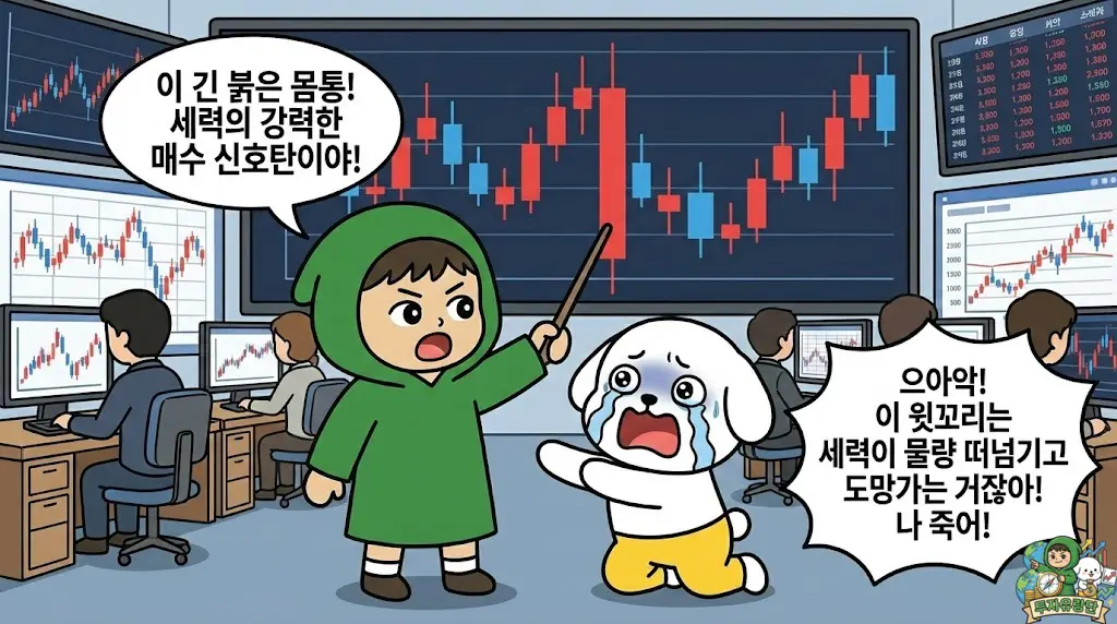 | 장대 (하락) | 매도세 완승, 심각한 패닉 셀링 발생 | 절대 매수 금지, 보유 시 즉각 비중 축소 |