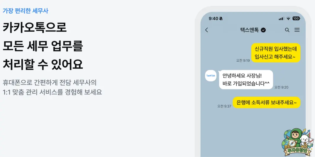 1. 택스앤톡은 카카오톡 기반의 간편 세무 기장 서비스로, 접근성이 매우 뛰어납니다.