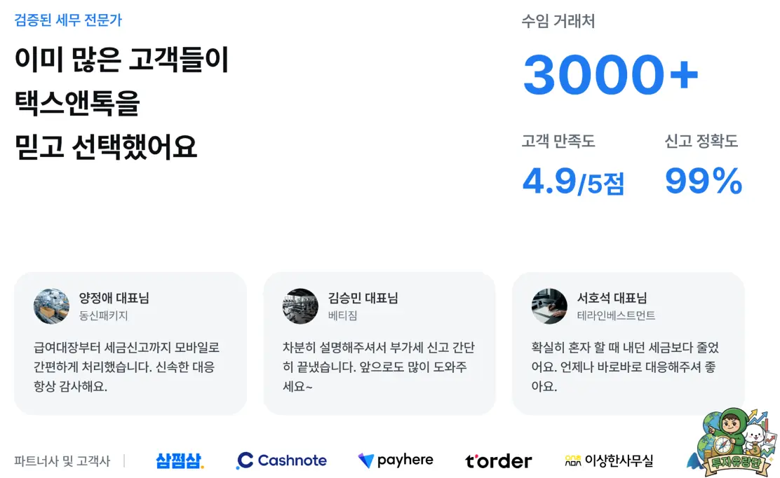 세금 관리는 사업의 기본이자 돈을 버는 또 하나의 방법입니다. 오늘 배운 택스앤톡은 바쁜 현대인들에게 가장 최적화된 세무 파트너가 될 수 있습니다.