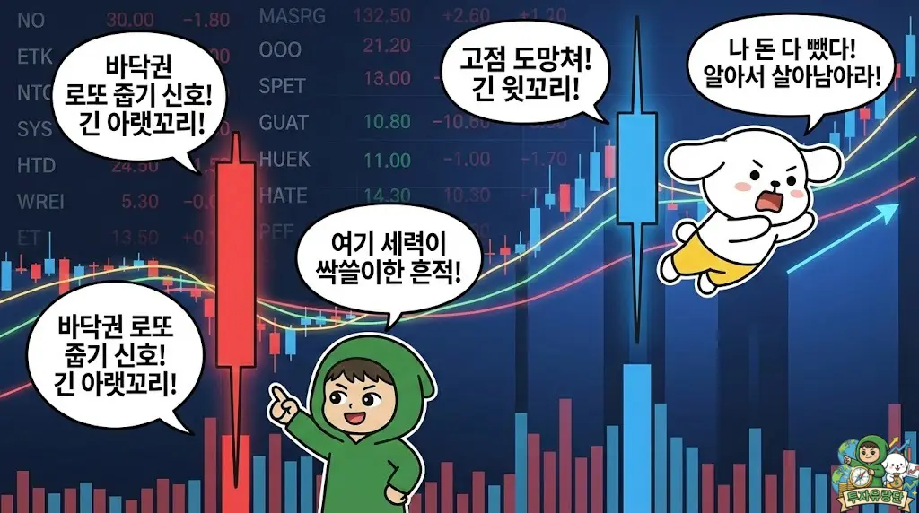 | 짧은 꼬리들 | 횡보 구간 (박스권 지루한 장) | 매수와 매도 힘이 팽팽하게 눈치 보는 중 | 섣부른 매매 절대 금지, 확실한 방향성 확인 후 진입 |