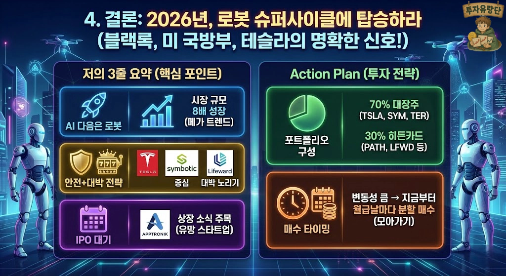 포트폴리오 구성: 대장주(TSLA, SYM, TER) 70% + 히든카드(PATH, LFWD 등) 30% 비율 추천.