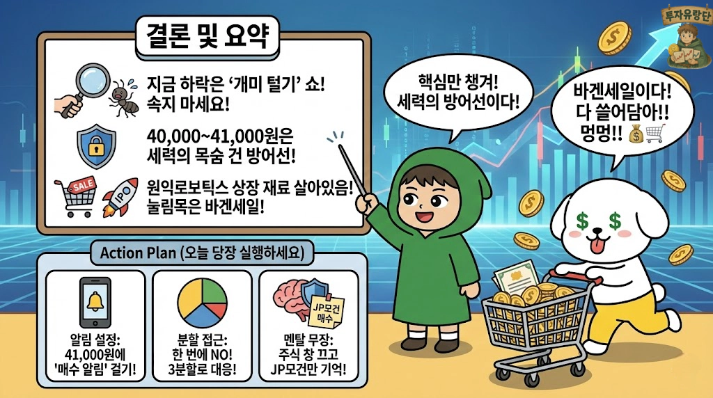 지금 당장 몰빵 안 합니다. 주가가 40,000원~41,000원 밴드에 들어올 때, 1,000만 원을 300씩, 300씩, 400씩 3번에 나눠서 분할 매수합니다. 원익로보틱스 상장 예비 심사 청구 뉴스 뜨는 순간, 전고점 돌파 나옵니다. 보수적으로 잡아도 최소 20~30% 수익(200~300만 원) 챙기는 자리입니다.